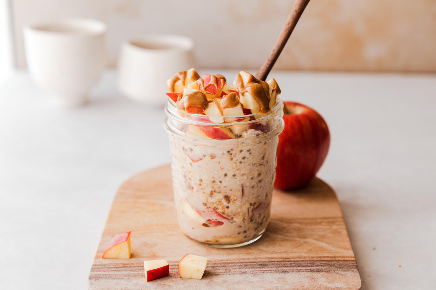 In a mason jar or a bowl, combine the following ingredients: oats, shredded apple, almond milk, maple syrup, vanilla extract, chia seeds, and your choice of spices. Mix the ingredients thoroughly until they are well combined.